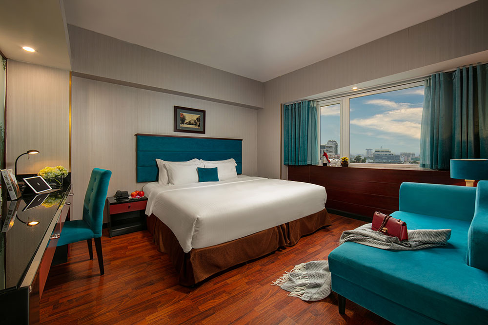 22 m2, these rooms feature luxurious bedroom with full range of luxurious services and contemporary amenities. Enjoy the choice of a King sized bed, and the convenient amenities  which makes it an ideal choice for those travelling with family and friends in search of a luxury hotel in Vietnam.